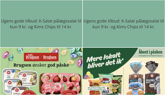 DagliBrugsen tilbyder K-Salat pålægssalat i flere varianter såsom tun, makrel, hønse, kylling og baconsalat. Hver pakke vejer mellem 100-150 g og koster kun 9 kr. pr. stk. Tilbuddet gælder fra fredag den 27. marts til onsdag den 1. april.